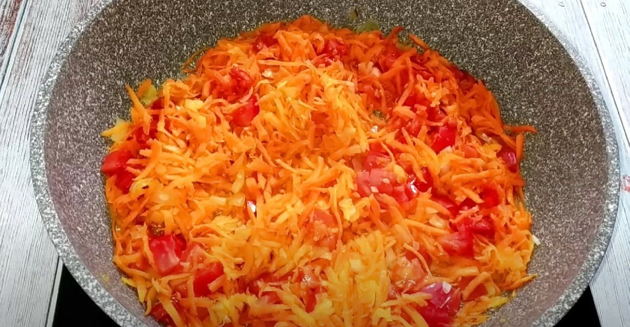ШАГ 6: В глубокой сковороде обжариваем лук, морковь и томат. Солим и перчим по вкусу.