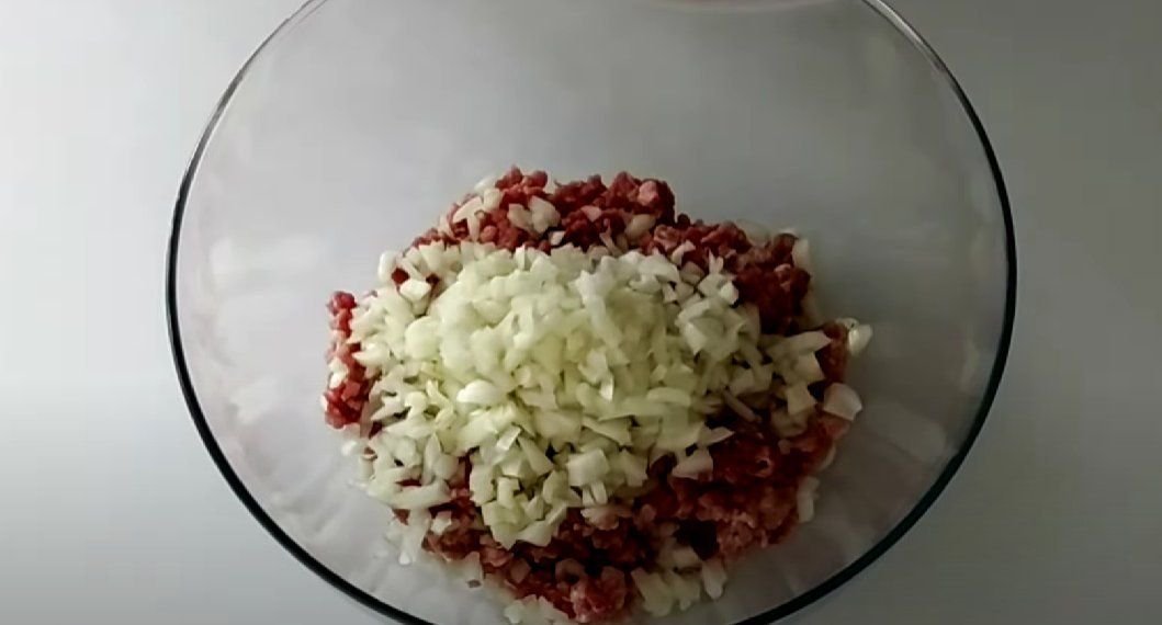 ШАГ 1: К фаршу (у меня свинина-говядина) добавляем мелко порезанный лук. Если не любите, когда попадаются кусочки лука — измельчите его блендером.