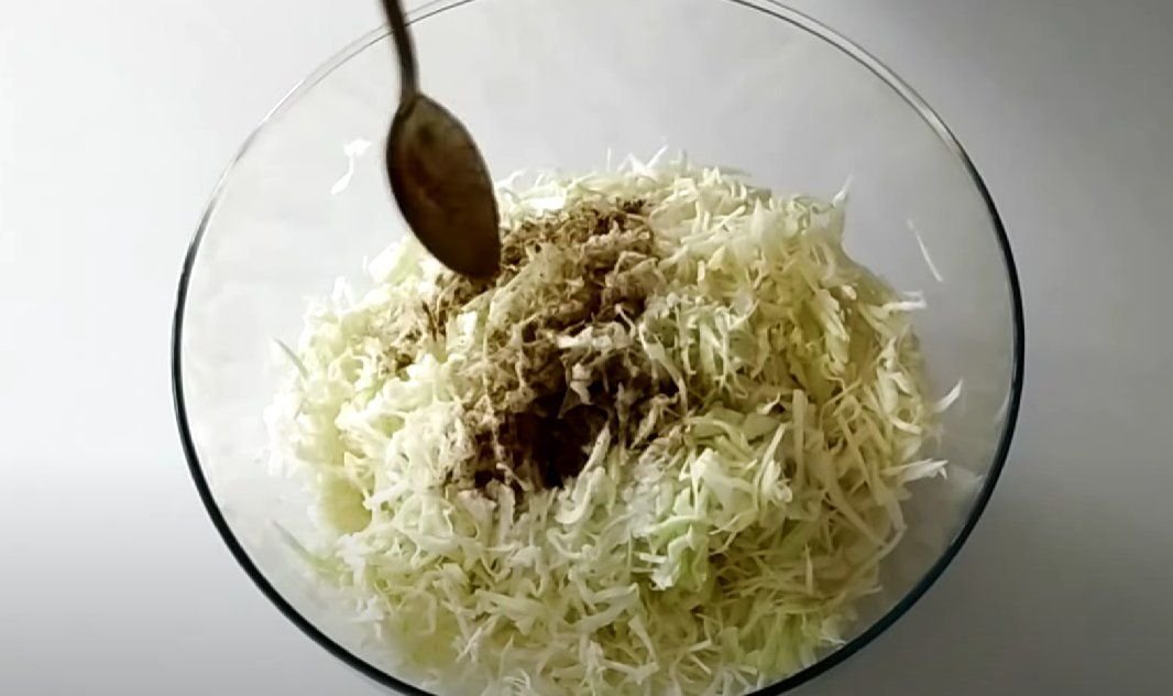 ШАГ 2: Капусту шинкуем тонкой паутинкой. Я натираю капусту на специальной терке. Смешиваем с фаршем, добавляем соль, перец и зиру.