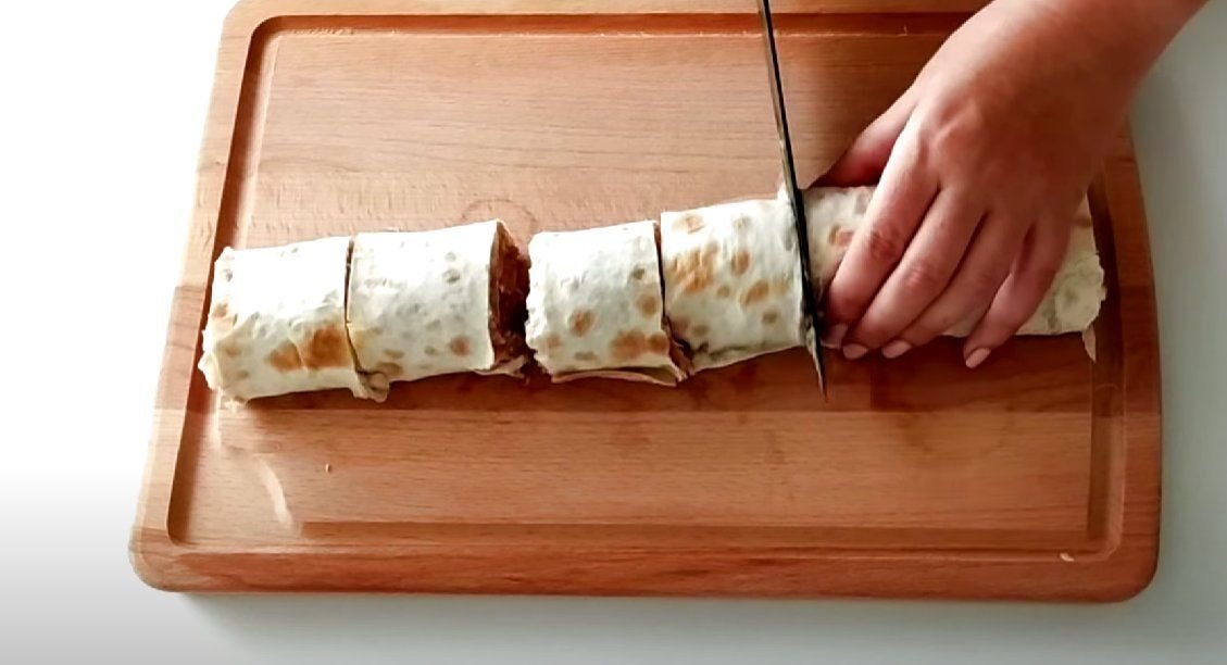 ШАГ 3: Крупный лист лаваша разворачиваем и равномерно выкладываем на него начинку. Заворачиваем лаваш в рулет.