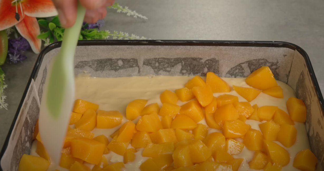 ШАГ 5: Перекладываем тесто в форму, а сверху выкладываем персики, порезанные на небольшие кусочки.