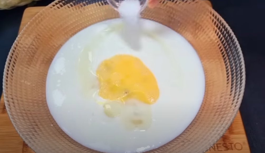 1. В глубокую тарелку влить тёплый кефир, добавить 2 яйца, растительное масло, сахар и соль. Хорошо перемешать до однородности.