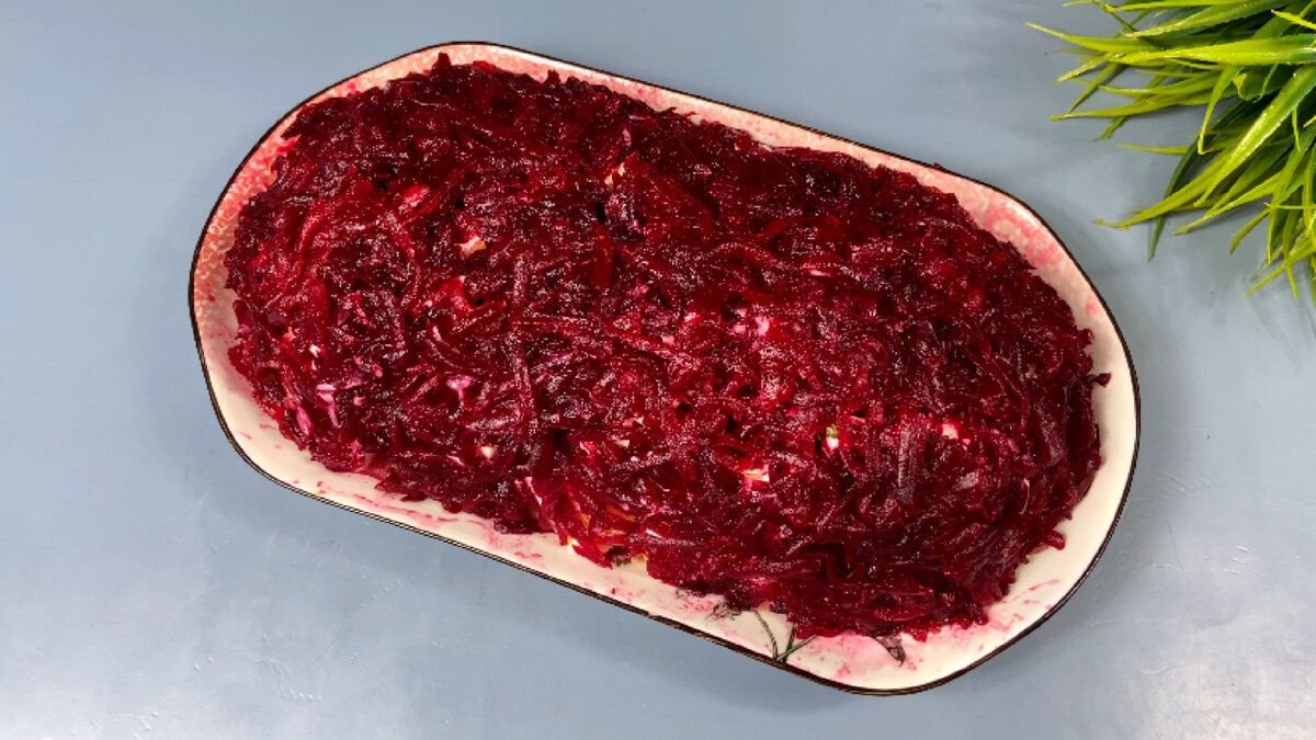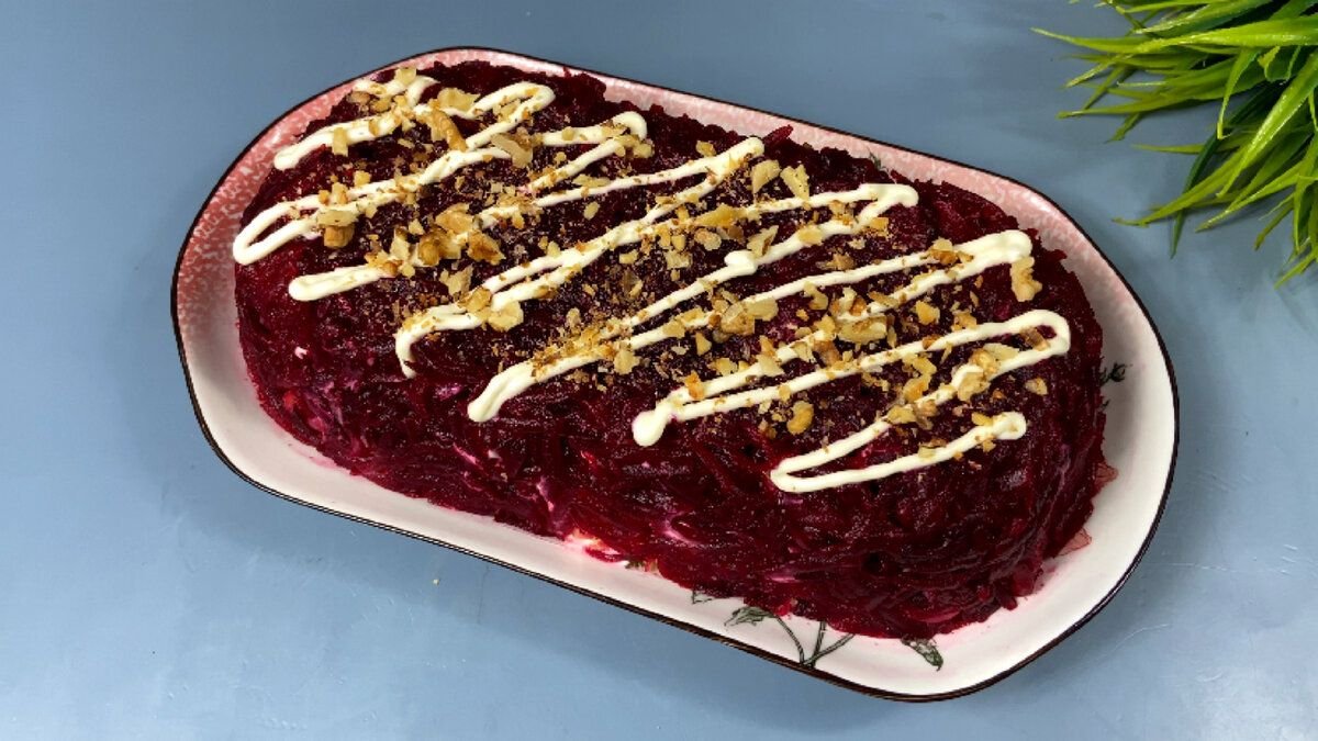 6. Последним слоем идет отварная свекла натертая на крупной терке, смазываем ее майонезом и посыпаем сверху измельченными грецкими орехами.