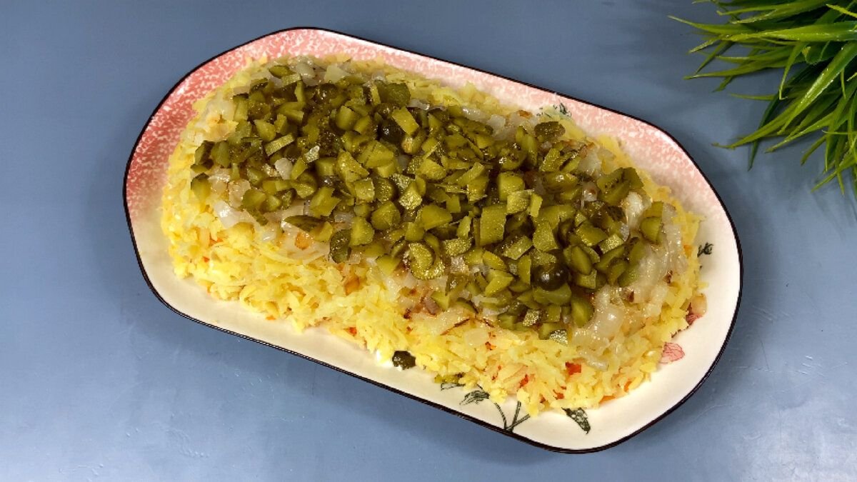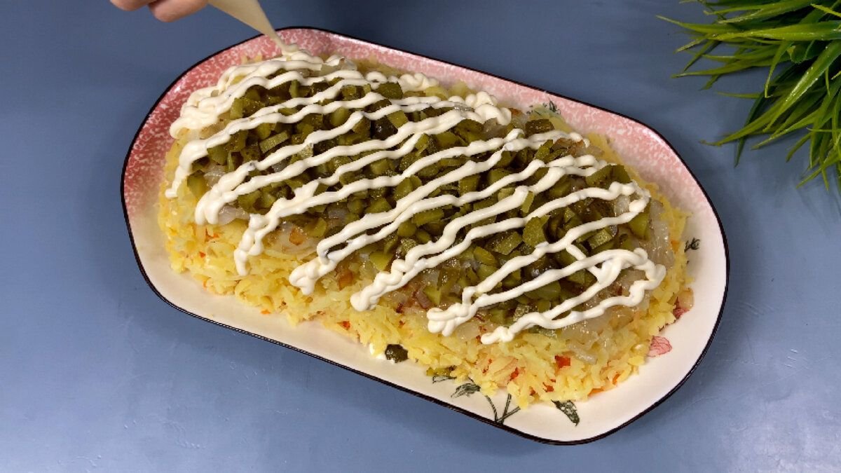 5. Затем выкладываем мелко нарезанные маринованные огурчики и смазываем майонезом.