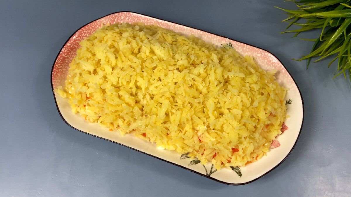 3. Смазываем морковь майонезом и сверху выкладываем ровным слоем отварной картофель натертый на крупной терке или можно его мелко нарезать.