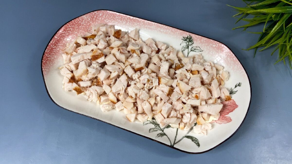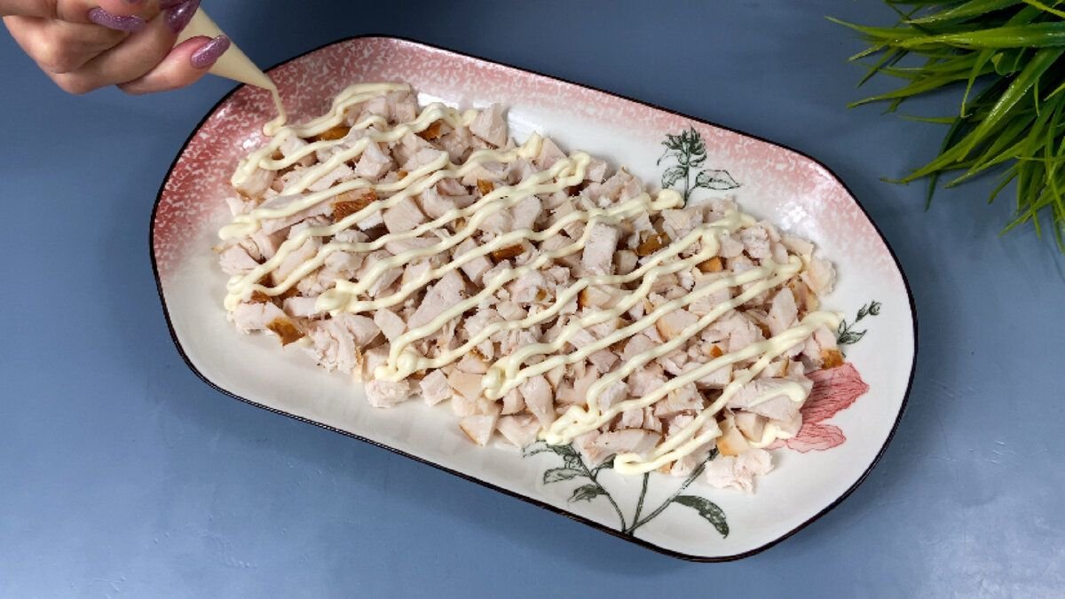 1. На дно блюда для салатов предварительно смазанное майонезом выкладываем ровным слоем нарезанную кубиком копченую куриную грудку.