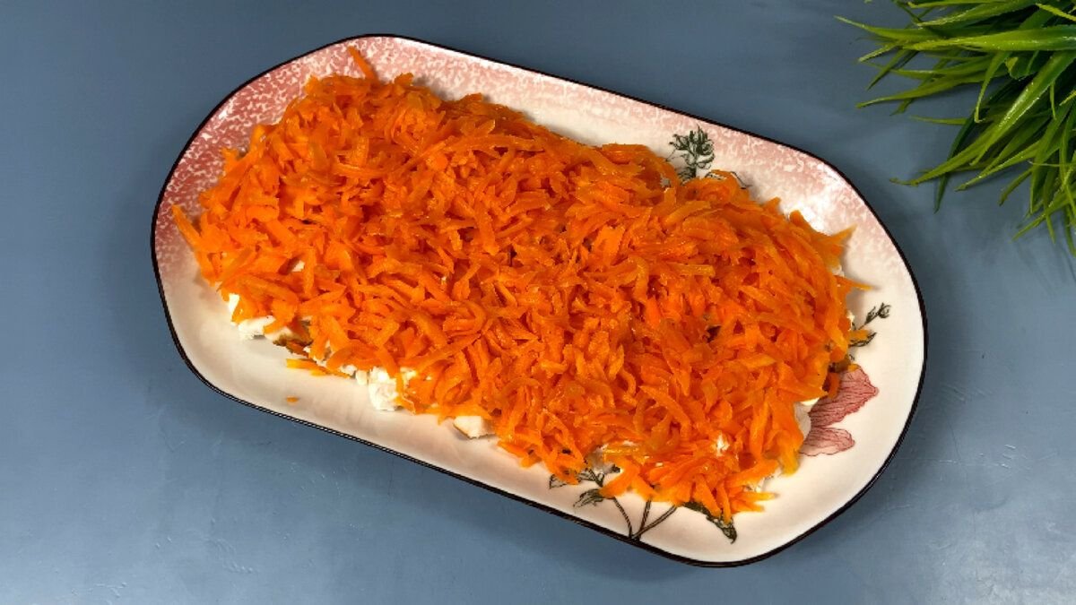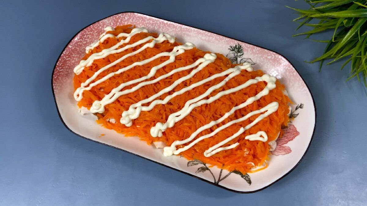 2. Смазываем грудку майонезом и следующим слоем выкладываем отварную морковь натертую на крупной терке.