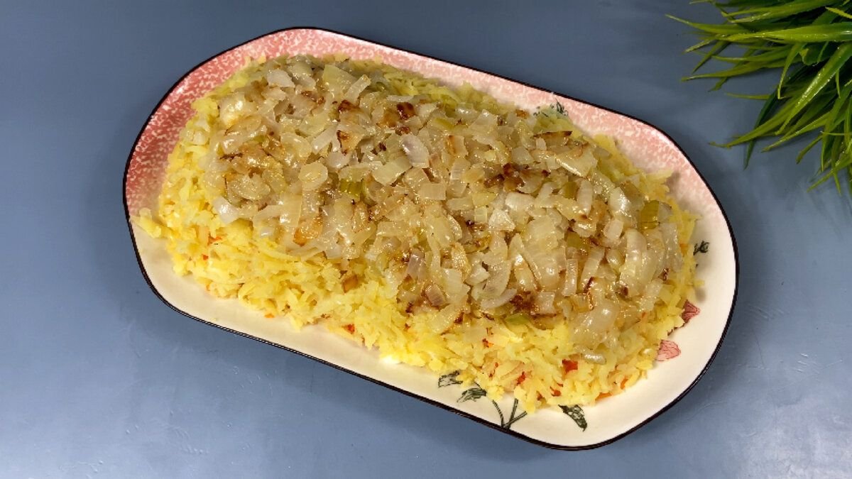 4. Репчатый лук мелко нарезаем, обжариваем на растительном масле до готовности и выкладываем на картофель.