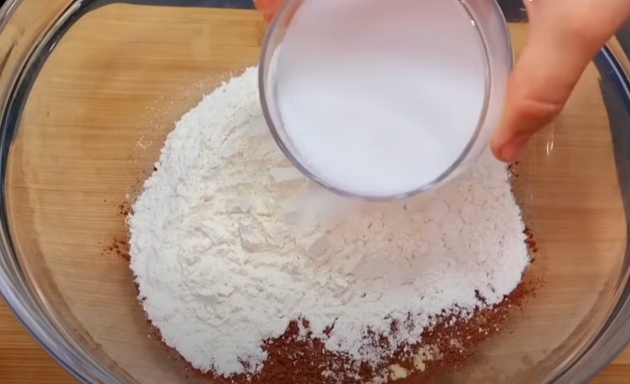1. Смешиваем в большой миске сыпучие ингредиенты: манная крупа, какао (лучше просеять через сито), мука (обязательно просеиваем через сито, чтобы мука насытилась воздухом), соль, сахар.