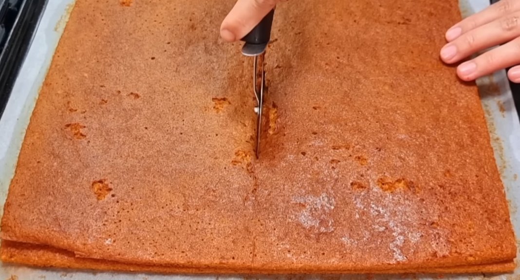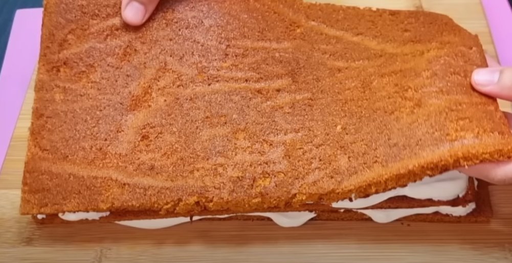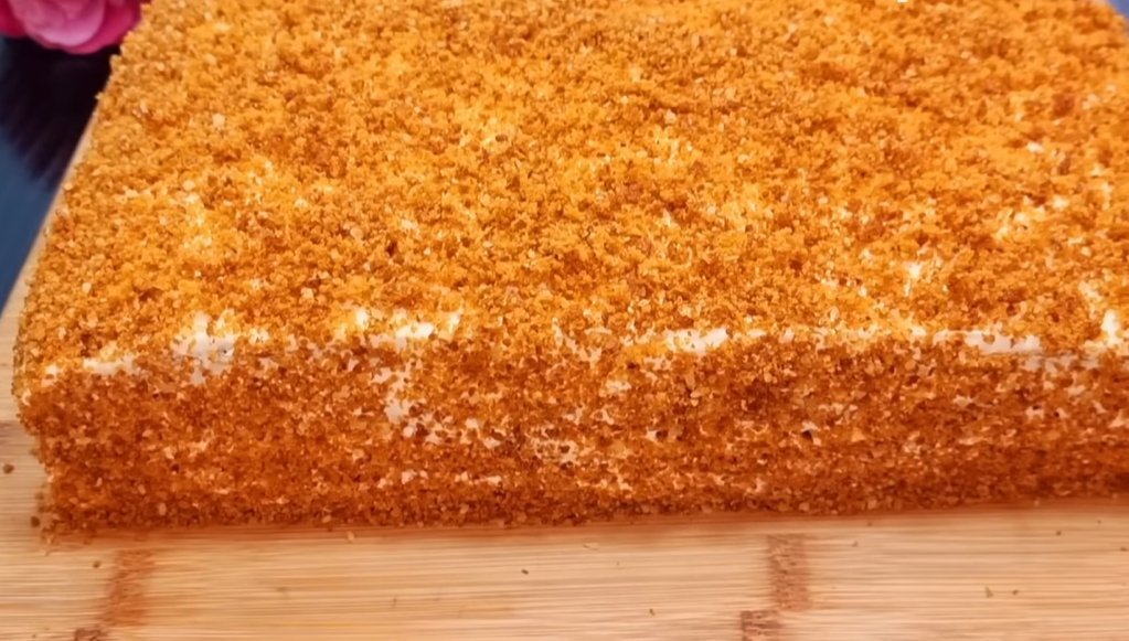 Сборка «Медовика»: У полученных коржей обрезать края и разрезать их вдоль. Смазать каждый корж кремом, убирая все неровности лопаткой. Срезанные края измельчить в блендере для посыпки торта. Полученный тортик отправить в холодильник на 2 часа, а желательно на ночь.