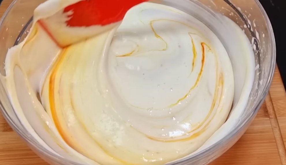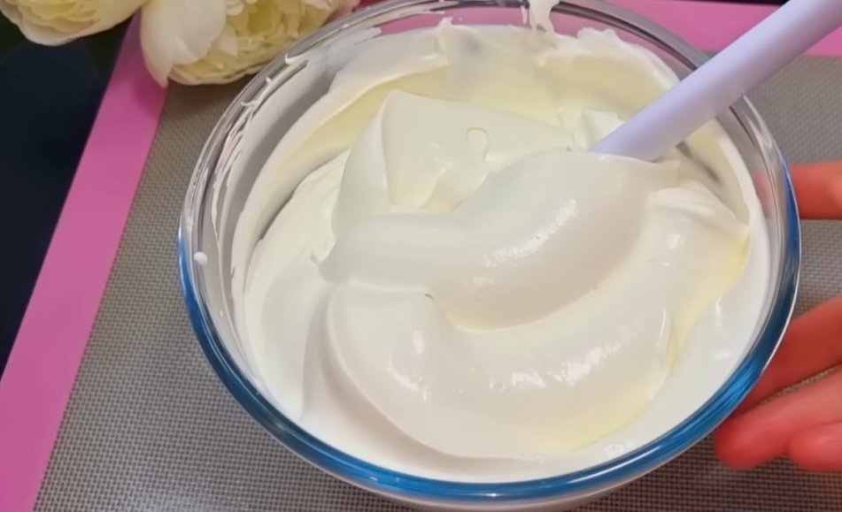 Крем можете приготовить по своему вкусу. У нас будет такой рецепт: взбить до густоты сливки 300 мл. (30%) и сгущенное молоко 100 мл.