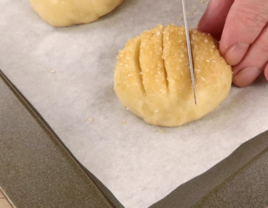 Делим его на две части, каждую скатываем в колбаску и режем на 8 кусочков. Скатываем шарики.