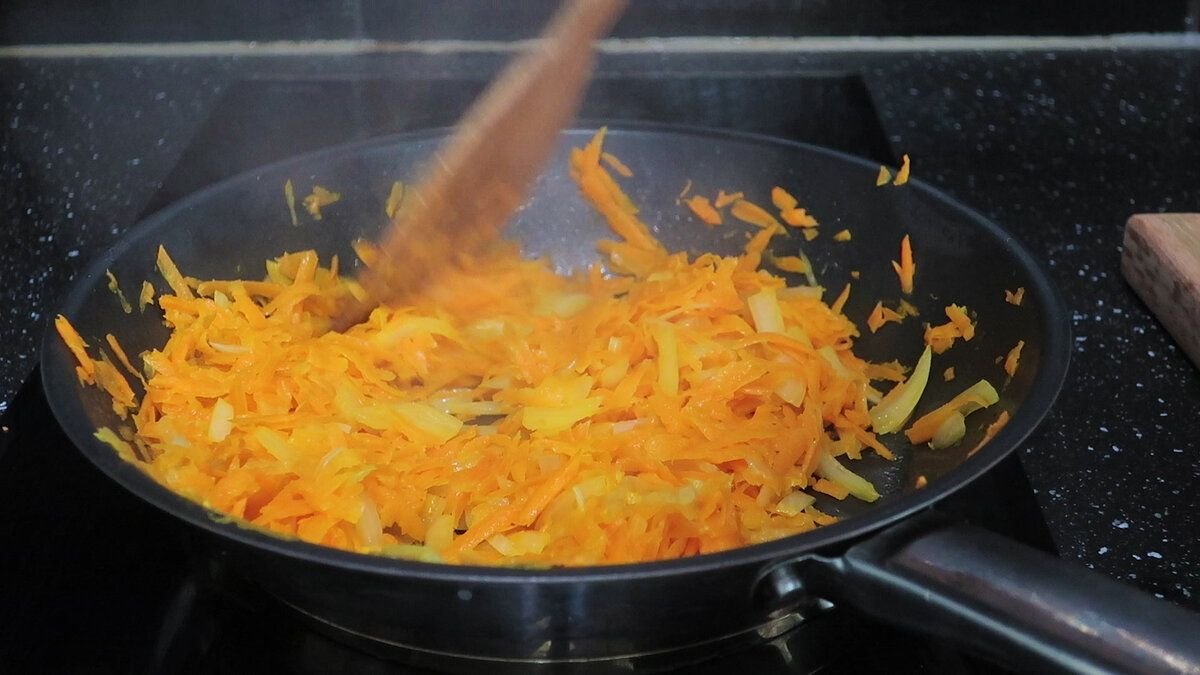 Единственное, что нам необходимо пожарить заранее, это овощи лук с морковь. Но и это не обязательно. Морковь натираем на терке и измельчаем лук. Обжариваем овощи на небольшом количестве растительного масла до мягкости.