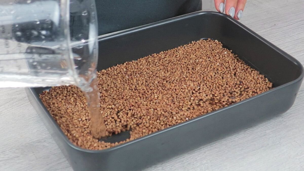 Промываем 250 г гречки. Перекладываем ее в форму для запекания. Заливаем гречку 500 мл воды.