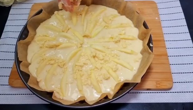 4. Форму (у меня 28 см.) застилаем бумагой и выливаем всё тесто, разравниваем его по всему объёму. Режем яблоко и выкладываем сверху дольки (вертикально вставляем их в тесто).