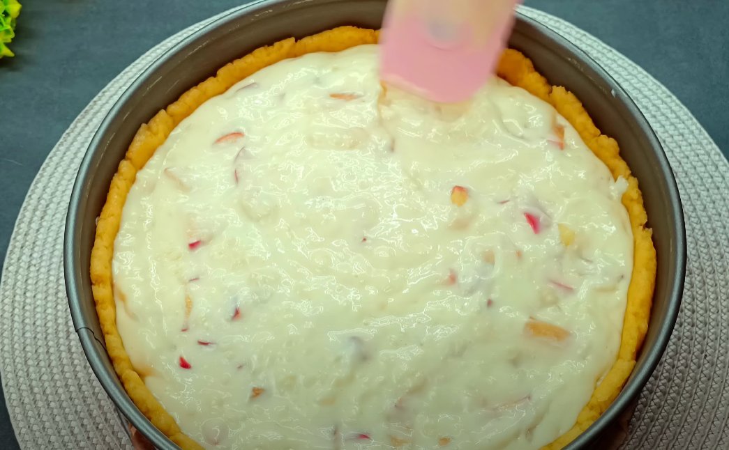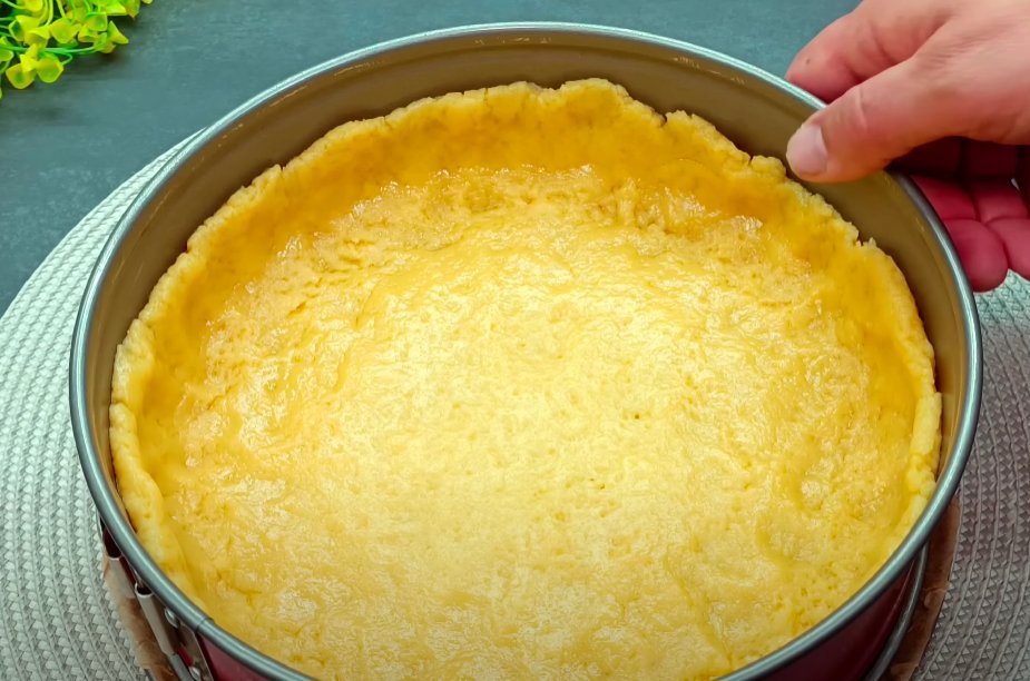ШАГ 5: Остальное тесто распределяем руками по форме и ставим в холодное место пока готовим крем.