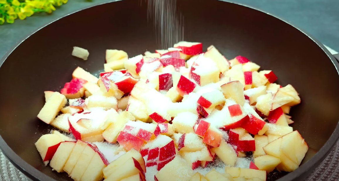 ШАГ 6: Яблоки нарезаем на небольшие кусочки и обжариваем их в сахаре с добавляием лимонного сока на сковороде минут 7.