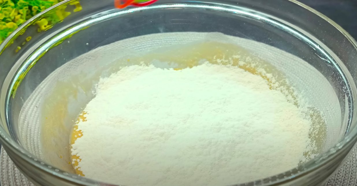 ШАГ 3: Просеиваем муку с разрыхлителем, замешиваем тесто руками.