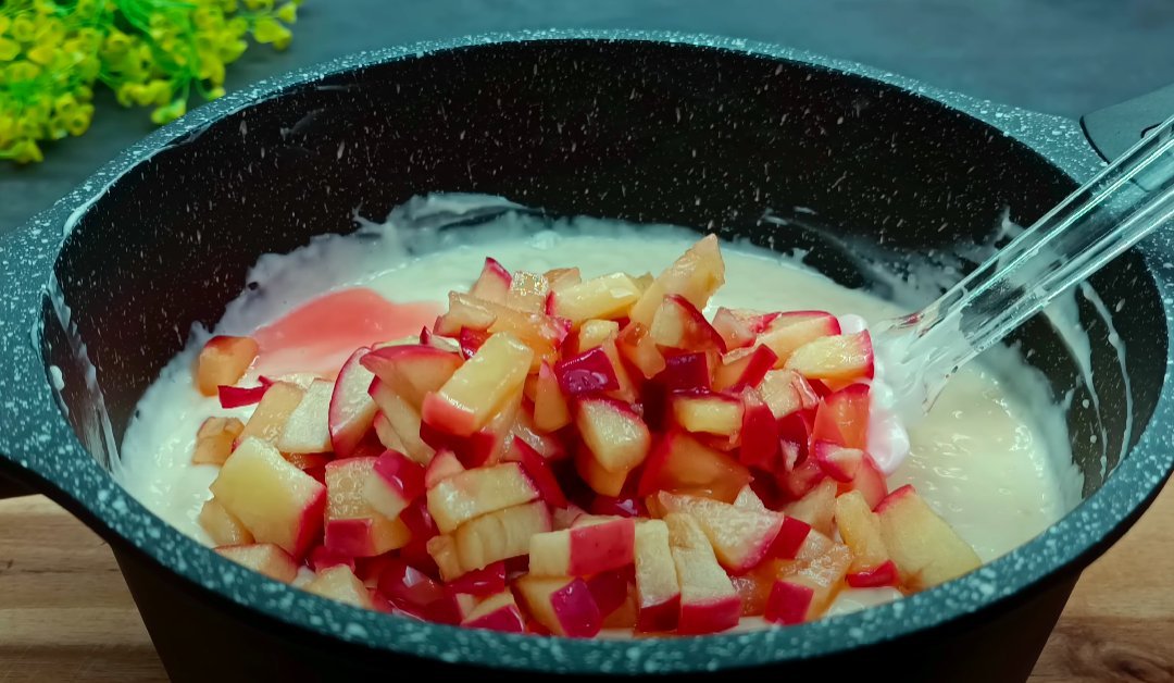 ШАГ 10: Яблоки выкладываем в крем. Размешиваем.