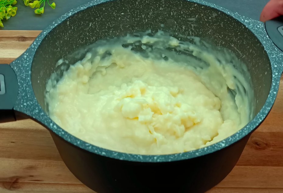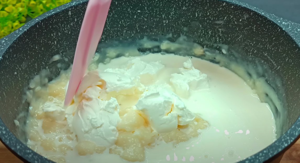 ШАГ 9: В готовый крем добавим сливки и сливочный сыр. Размешаем до однородности и снимем с огня.