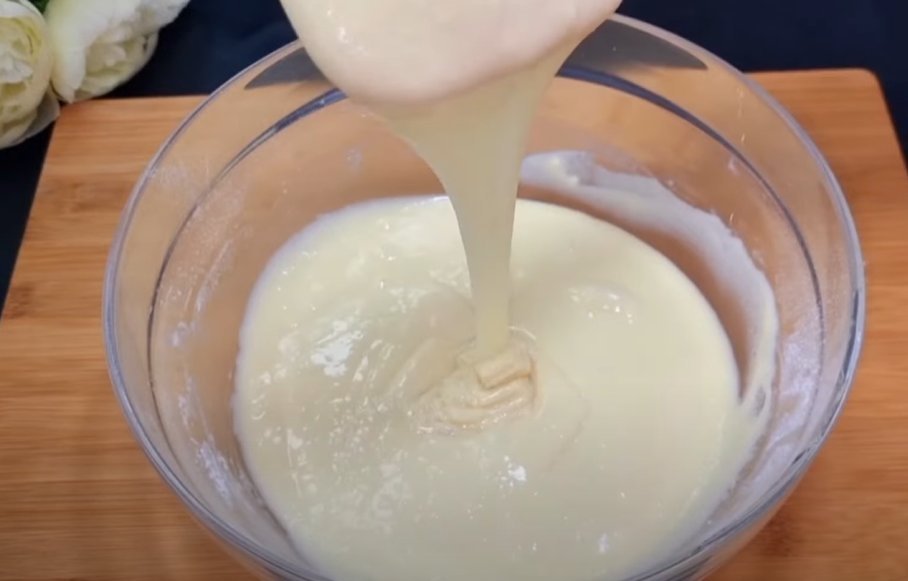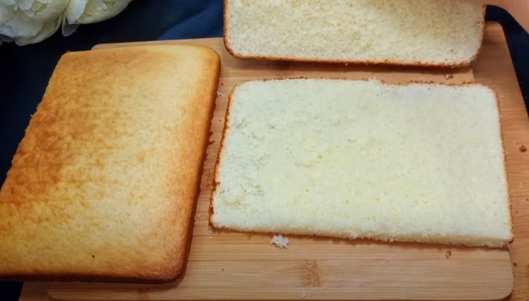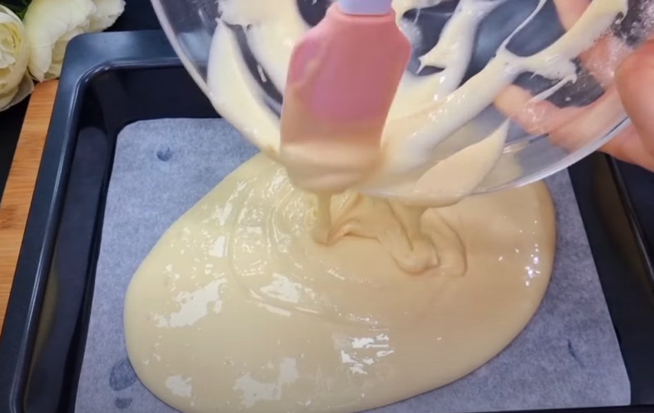 2. В полученную смесь просеять 140 гр. муки, 1 ч. л. разрыхлителя и так же хорошенько взбить миксером, чтобы не было комочков.3. В форму для выпекания диаметром 30 см на 20 см вылить получившуюся смесь, разровнять силиконовой лопаткой по форме и выпекать 15 минут при температуре 180 С.Крем
