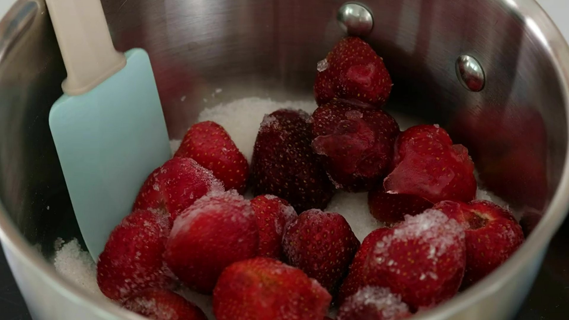 2. В ковше с толстым дном соединим сахар и агар, хорошо перемешаем. Добавим замороженную клубнику.