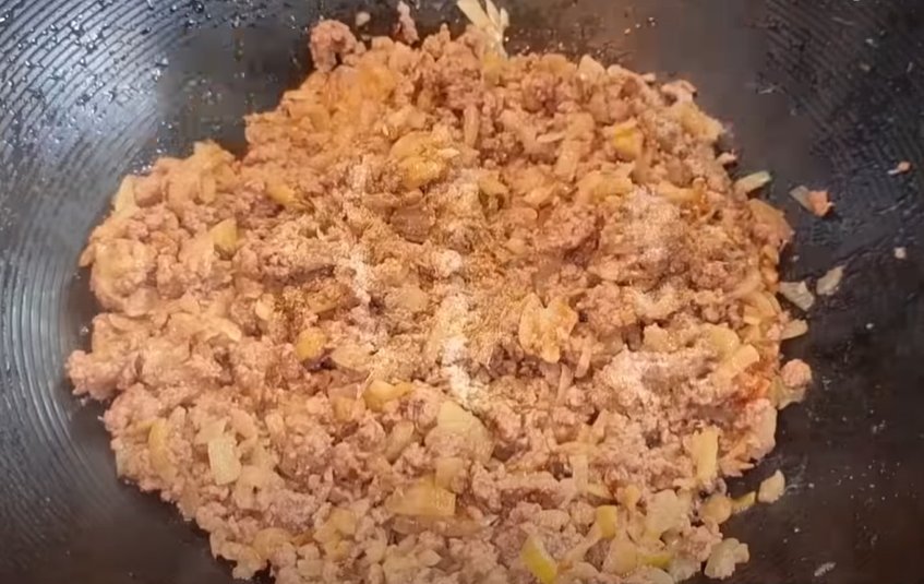 4. В сковороду добавить фарш и оставить обжариваться. Сразу перемешать лопаткой, чтобы разбить фарш на более мелкие частицы. Добавить соль, перец и специи по вкусу. Тушить на слабом огне до готовности примерно 10-15 минут под крышкой.