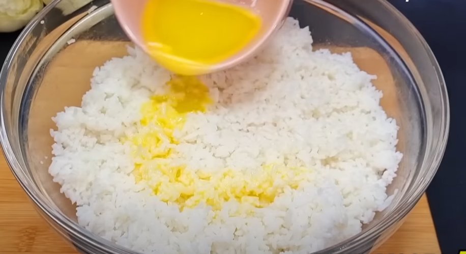 2. Растопить сливочное масло и добавить к рису. Туда же разбить 3 куриных яйца. Можно добавить сыр по желанию. Перемешать массу вилкой до однородности.